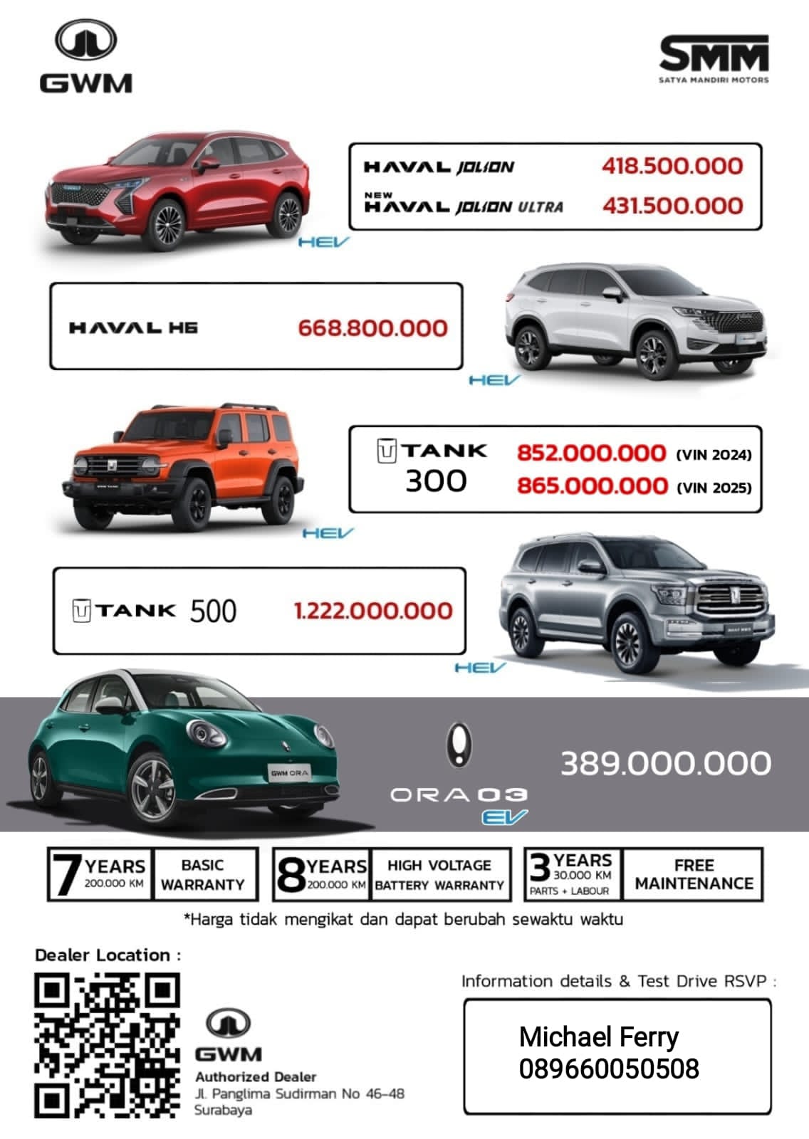 Info Lebih Lanjut, Hubungi: Michael Ferry Supervisor Telp/WA : 0896 6005 0508 Dealer GWM Area Jatim.Com Alamat: Panglima Sudirman No 46-48, Surabaya, Indonesia 60118